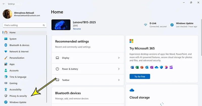 در ویندوز ۱۱، به بخش «تنظیمات» (Settings) بروید و سپس گزینه «حریم خصوصی و امنیت» (Privacy & Security) را انتخاب کنید.