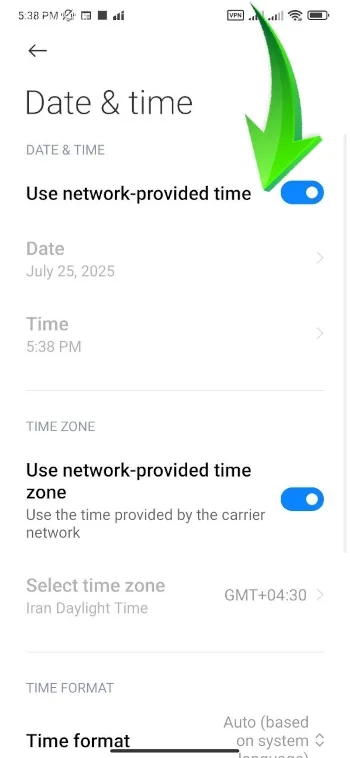 تنظیم “استفاده از زمان ارائه شده توسط شبکه” را روشن کنید.