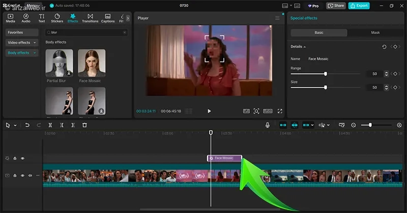 برای محو کردن صورت در برنامه کپ کات، بعد از اینکه ویدیوی خود را وارد برنامه کردید، به قسمت افکتهای ویدیو بروید. سپس گزینه «محو کردن» یا «موزاییک صورت» را انتخاب کنید.