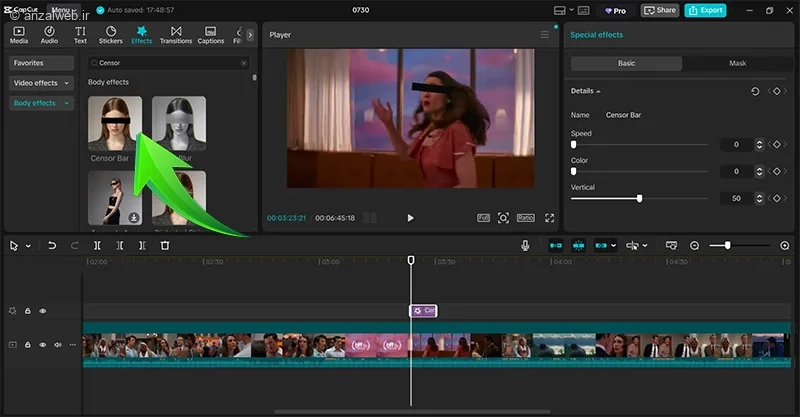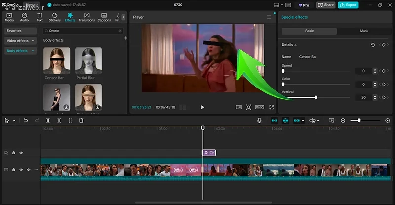 اگر قصد دارید تنها چشمهای افراد موجود در ویدیو را پنهان کنید، میتوانید در قسمت «Body Effects» دنبال گزینه «Censor» بگردید و سپس «Censor Bar» را انتخاب نمایید.