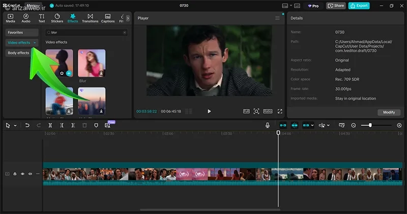 پس از اینکه ویدیوی خود را وارد برنامه کردید و به قسمتی رسیدید که میخواهید اطلاعات آن تار شود، روی گزینه Effects کلیک کنید. سپس به بخش Video Effects بروید. در کادر جستجو، کلمه Blur را تایپ کنید و اولین گزینهای که نمایش داده میشود را انتخاب کنید.