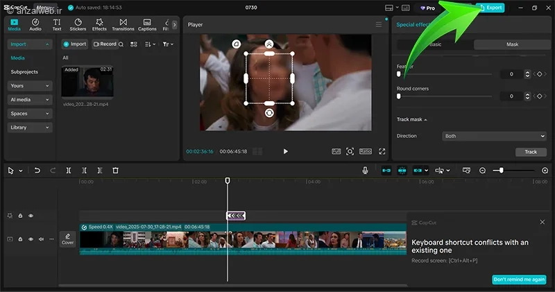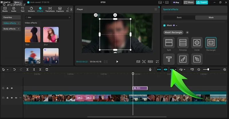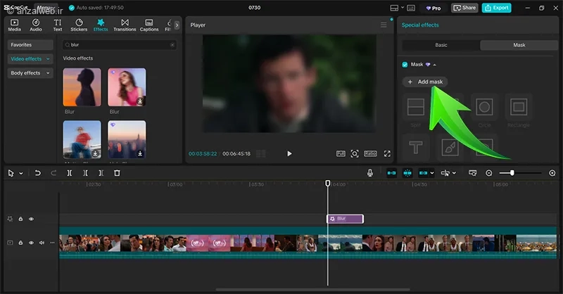 همچنین میتوانید با استفاده از گزینه «اضافه کردن ماسک»، به صورت دستی محل قرارگیری کادر محو را در قسمتهای مختلف ویدیو تغییر دهید.
