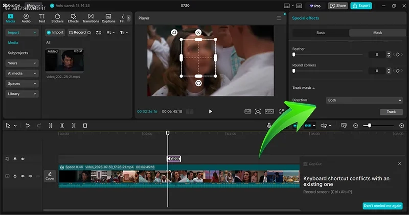 برای اینکه پلاک ماشین یا چهره افراد در ادامه ویدیو هم محو و ناواضح بماند، پس از انتخاب ناحیه مورد نظر، در قسمت Track Mask گزینه Both را انتخاب کنید و سپس روی دکمه Track کلیک نمایید.