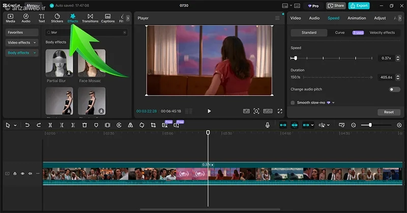 برای اعمال افکت روی بدنه ویدیو، از قسمت افکتها، گزینه Body Effects را انتخاب کنید. سپس در کادر جستجو، کلمه Blur را تایپ نمایید. اگر این بخش را نمیبینید، احتمالاً برنامه کپ کات به اینترنت وصل نیست و لازم است VPN خود را تغییر دهید.