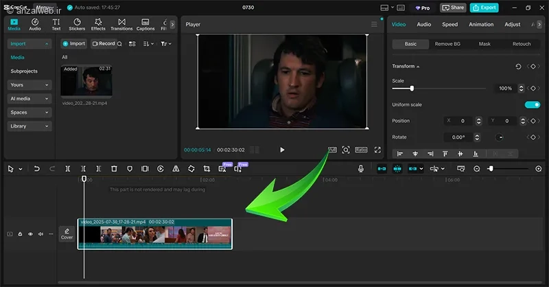 برای شروع کار، ابتدا باید فیلم مورد نظرتان را به بخش ابزارهای کپ کات منتقل کنید تا بتوانید تغییرات و افکتهای مختلف را روی آن پیاده کنید. برای این کار، ویدیویی که در قسمت سمت چپ برنامه قرار دارد را با ماوس بگیرید و به سمت نوار ابزار اصلی بکشید و رها کنید.