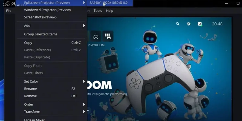 برای نمایش تصویر به صورت تمامصفحه، روی نوار بالایی برنامه OBS کلیک راست کنید. سپس از بخش «نمایشگر تمامصفحه» رزولوشن مورد نظر خود را انتخاب نمایید.