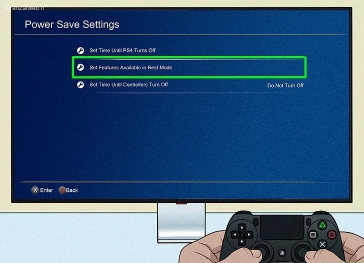 به بخش تنظیمات (Setting) برگردید. سپس وارد قسمت تنظیمات صرفهجویی در انرژی (Power Save Settings) شوید. حالا گزینهای به نام «تعیین قابلیتهای موجود در حالت استراحت» (Set Features Available in Rest Mode) را انتخاب کنید.