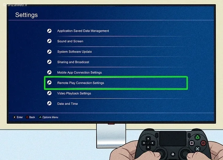 به قسمت تنظیمات (Setting) برگردید. حالا گزینهی مربوط به تنظیمات اتصال ریموت پلی (Remote Play Connection Settings) را پیدا کرده و گزینه فعالسازی ریموت پلی (Enable Remote Play) را روشن کنید. حتماً چک کنید که هم کنسول و هم لپتاپ شما به یک شبکه وایفای متصل باشند.