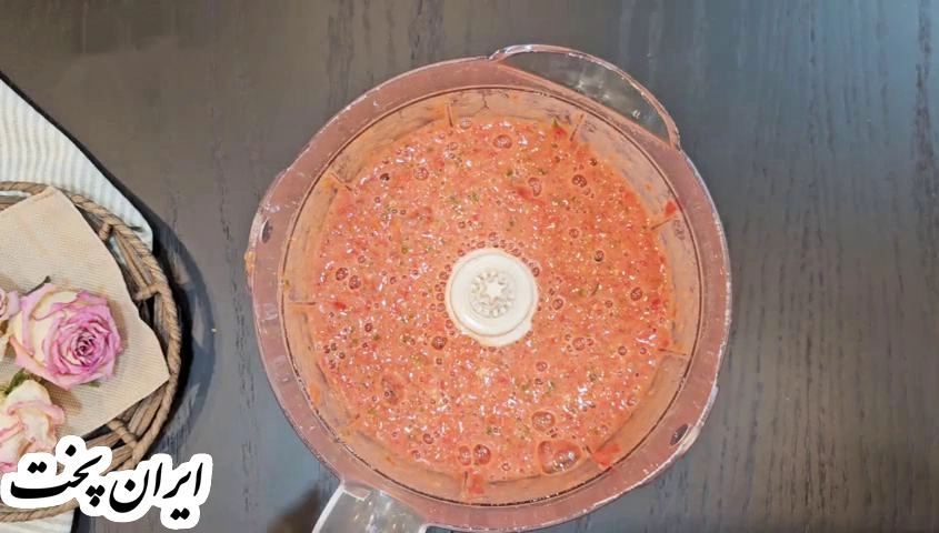 گوجه و فلفل دلمه ای و سیر رو داخل غذاساز یا مخلوط کن بریزین و پوره کنید. اگر دستگاه ندارین، همه مواد رو رنده کنید.