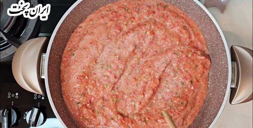 اجازه بدین روی حرارت بمونه. باید آب گوجه کشیده بشه.